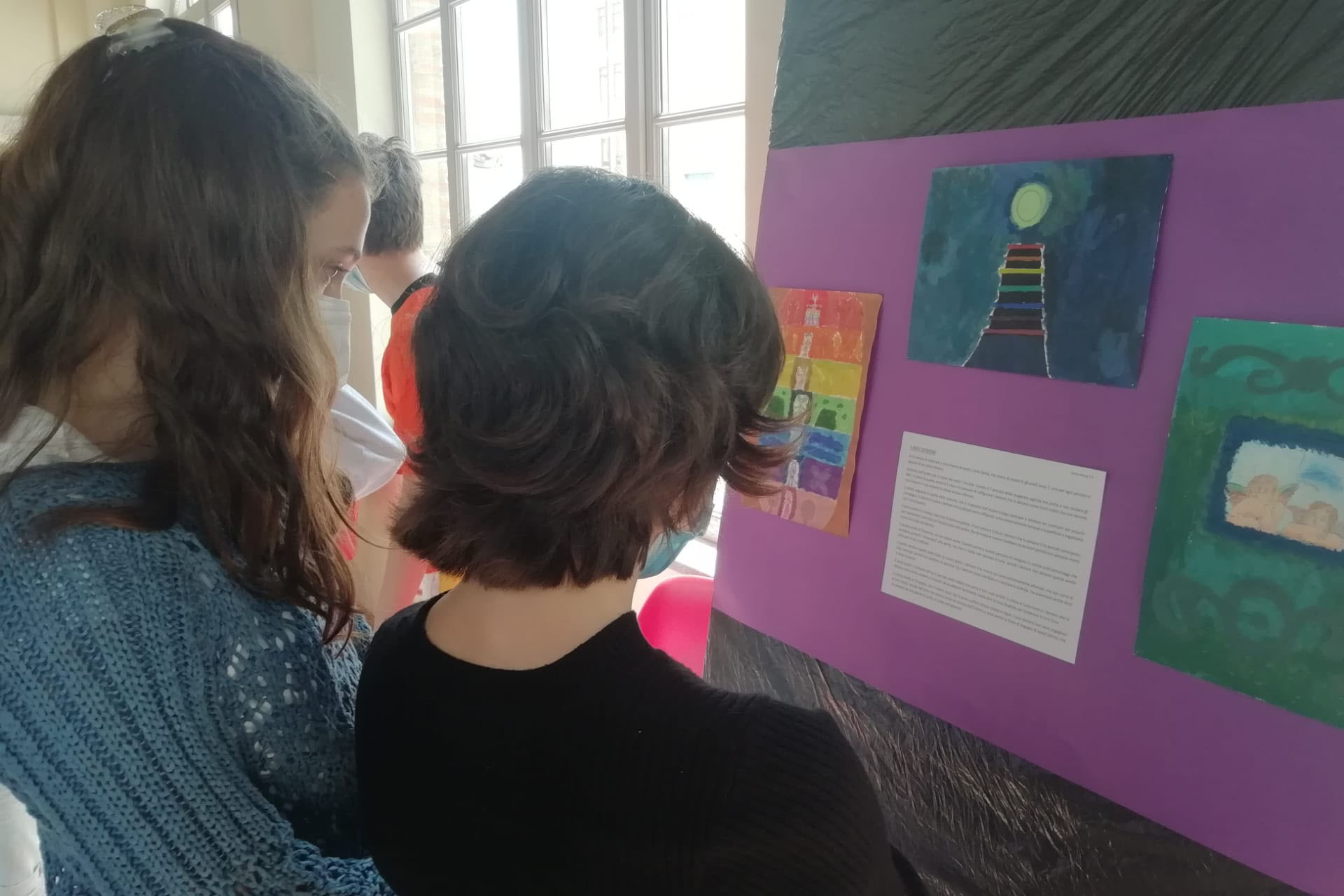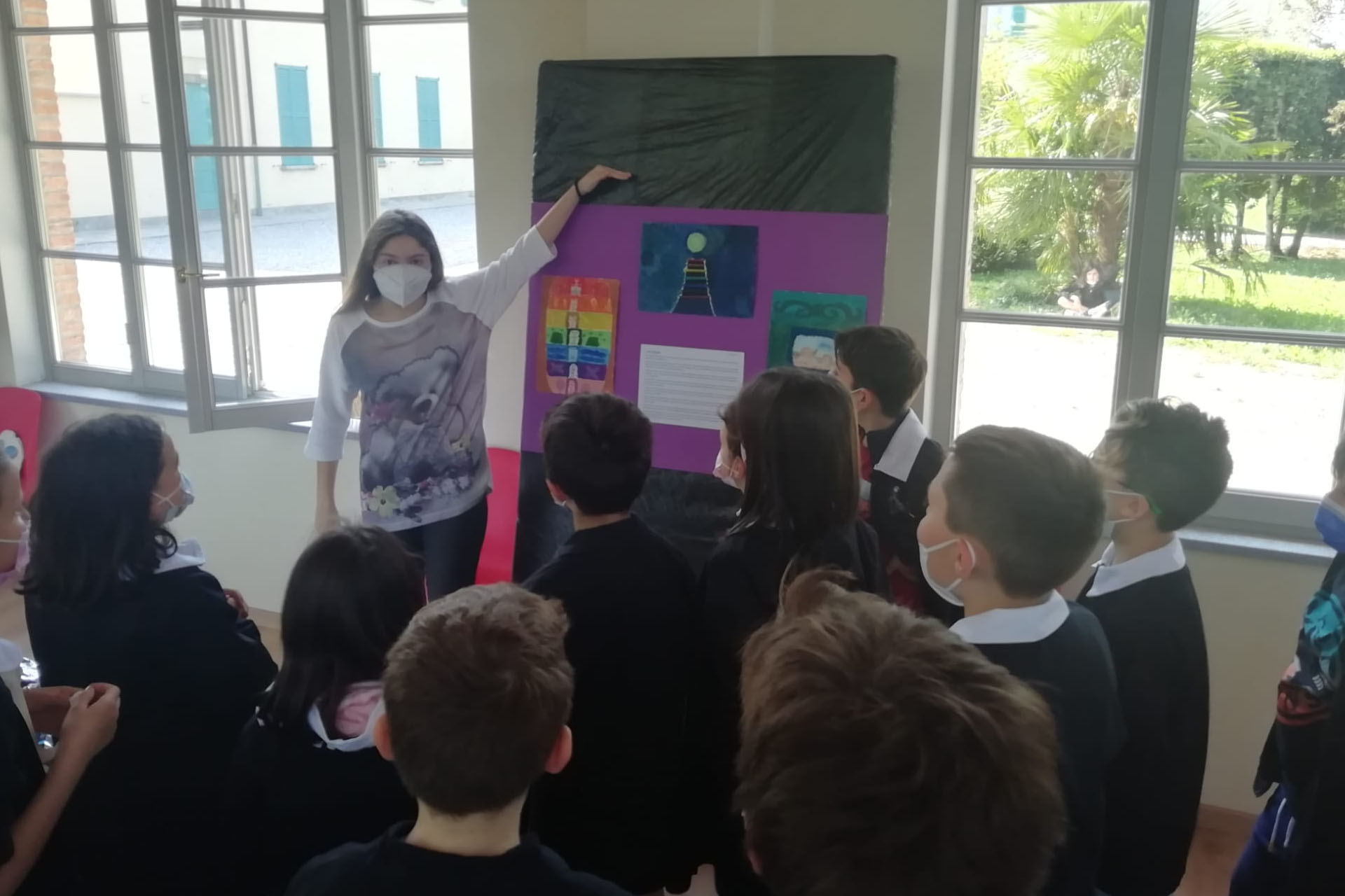Nella casetta della scuola, abbiamo cosi allestito una mostra temporanea, dove sono stati esposti gli elaborati artistici dei ragazzi. E abbiamo aperto le porte a tutte le classi. Dapprima senza guida, ogni bambino coi propri pensieri e tempi, successivamente accompagnati dalla docente i bambini osservavano le opere con particolare attenzione ai significati espressi e alle scelte tecniche artistiche.