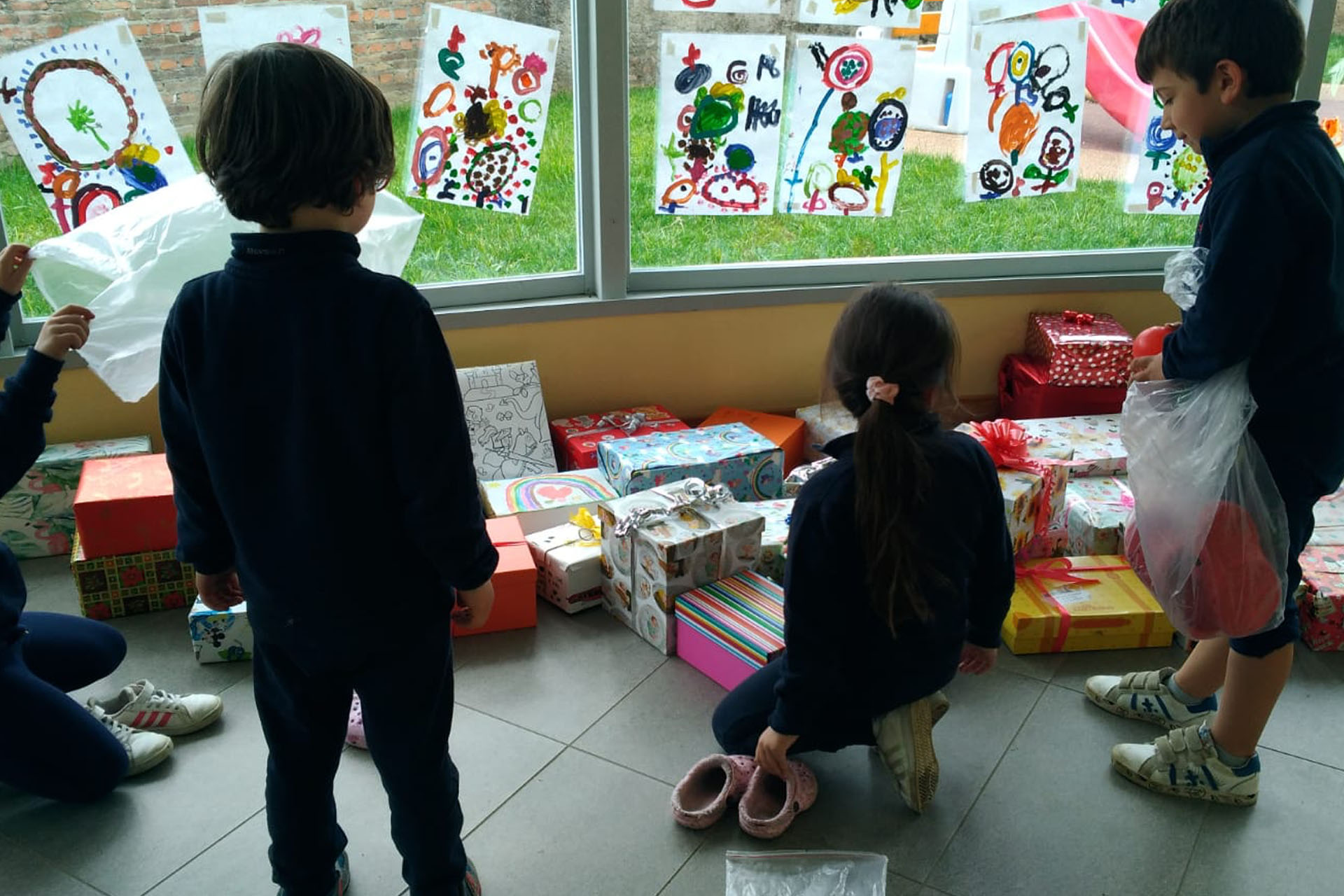 6 maggio, suona la campanella, i bambini si affrettano ad entrare con la loro scatola sotto il braccio; in men che non si dica l’atrio d’ingresso della nostra scuola si è riempito di pacchetti regalo…sembrava di essere a Natale!