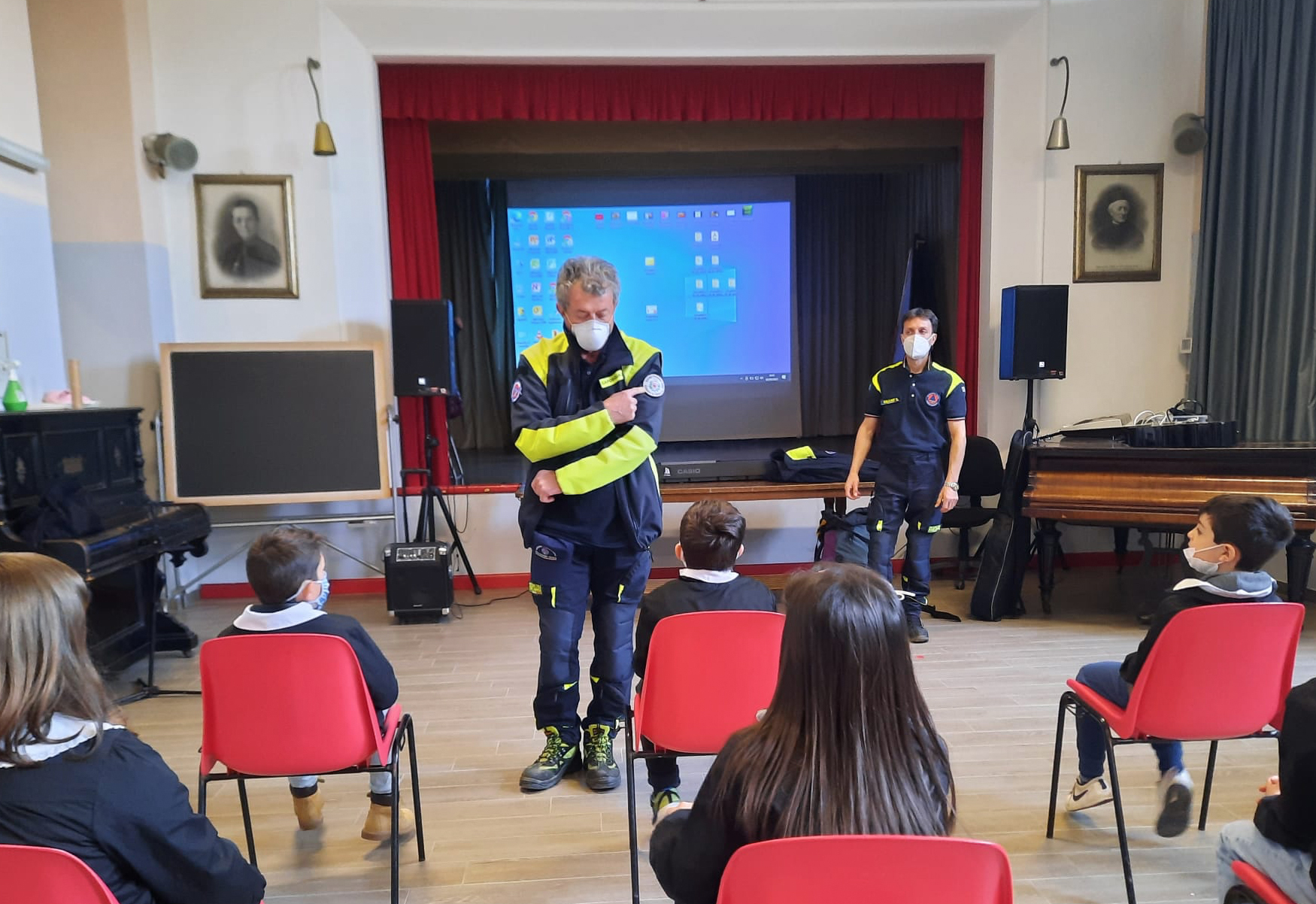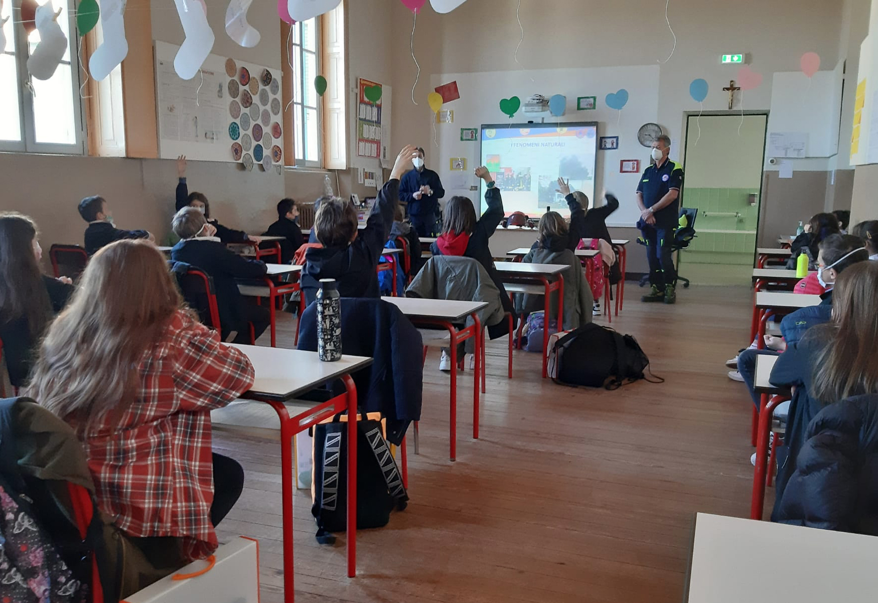 I volontari, aiutati da alcune immagini, hanno descritto i vari eventi calamitosi (Incendio, Terremoto, Frana, Calura e Alluvione) e illustrato il comportamento da adottare nel caso in cui questi si verifichino. Durante la parte teorica, gli alunni hanno partecipato attivamente, facendo molte domande e intervenendo raccontando le proprie esperienze vissute.