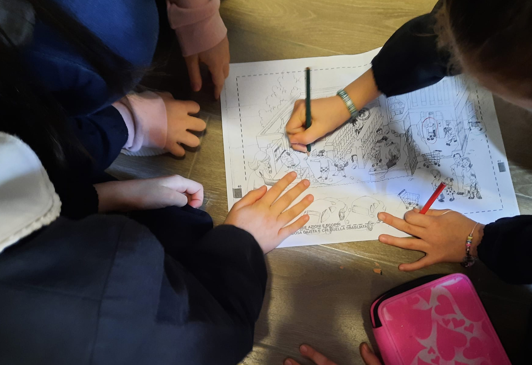 Gli alunni sono stati suddivisi in quattro gruppi e ad ognuno è stato dato un foglio con situazioni diverse. L’obiettivo? Indicare con il verde le azioni giuste/corrette (es. In caso di alluvione mi dirigo verso i piani alti) e con il rosso le azioni sbagliate/scorrette (in caso di terremoto vado al piano di sopra).
